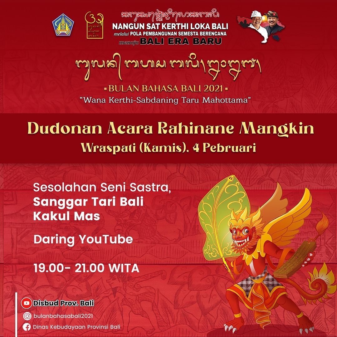 Dudonan acara Bulan Bahasa Bali 2021 rahinane mangkin, Whraspati, 4 Pebruari 2021.