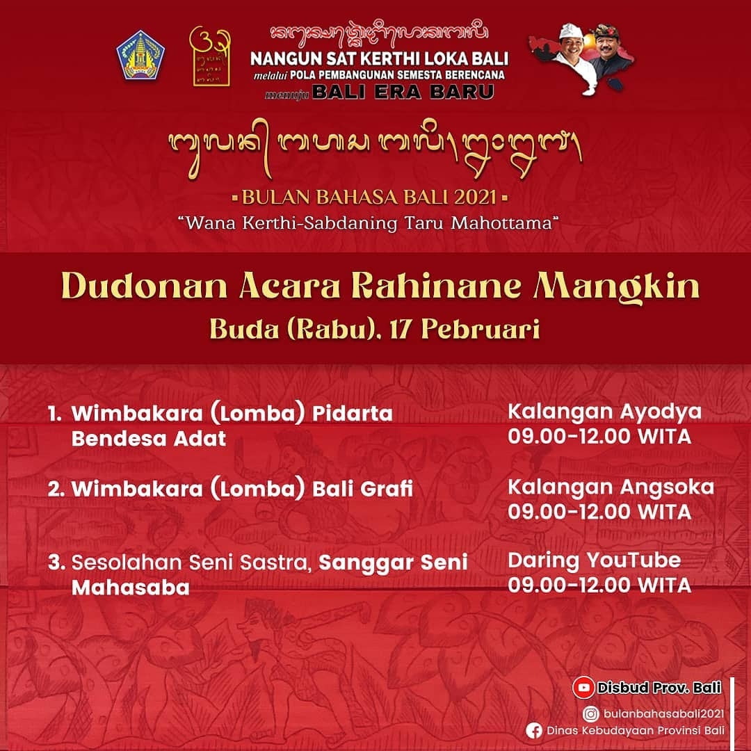 Punapi gatra? Benjang semengan, rahina Buda 17 Pebruari 2021 jam 09.00 WITA pacang wenten penayangan perdana (premier) sesolahan seni sastra saking Sanggar Seni Mahasaba sane mamurda “Basur: Tresnasih Kembang Sokasti”. Elingang nggih, tonton ring kanal YouTube Disbud Prov Bali.