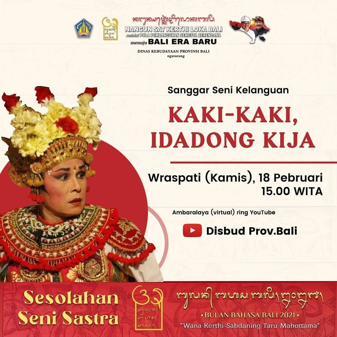 Elingang nonton Sesolahan Seni Sastra rahinane mangkin saking Sanggar Seni Kelanguan sane mamurda ” Kaki-kaki, I Dadong Kija” Wraspati, 18 Februari 2021 ring jam 15.00 WITA.