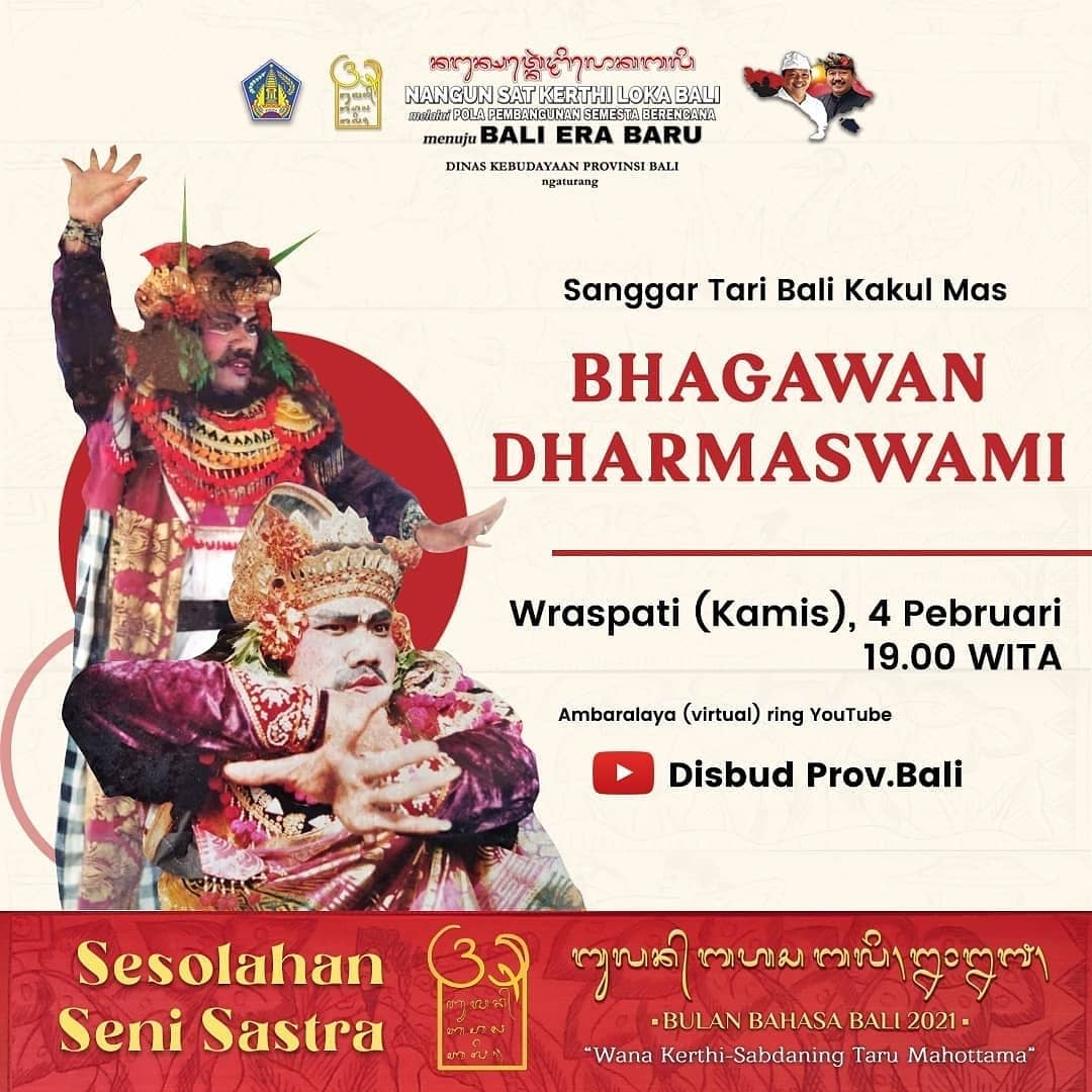 Sampunang lali nonton sesolahan seni sastra sane kamargiang mapaiketan sareng Bulan Bahasa Bali. Sesolahan mamurda Bhagawan Dharmaswami saking Sanggar Tari Bali Kakul Mas kasolahang rahinane mangkin Wraspati, 4 Februari 2021 galah 19.00 Wita.