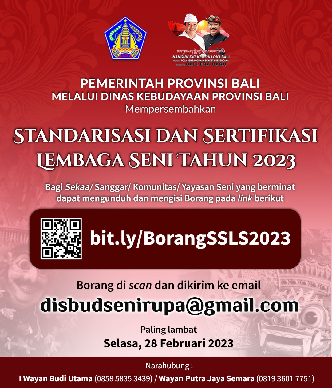 - Sehubungan dengan hal tersebut di atas, mengingat standarisasi dan sertifikasi sangat penting untuk dilakukan, maka mohon mengusulkan Sekaa/Sanggar/ Komunitas/Yayasan Seni untuk disertifikasi yang meliputi bidang seni tari, karawitan, pedalangan, teater, seni rupa, seni fotografi, seni film, seni desain dan seni sastra yang ada di wilayah masing-masing, dapat mengisi dan melengkapi borang (formulir) yang dapat diunduh melalui tautan https://bit.ly/BorangSSLS2023. Borang yang telah diisi, dilengkapi dan telah dipindai (discan) ke dalam bentuk soft copy, dapat dikirim ke email kami: disbudsenirupa@gmail.com.