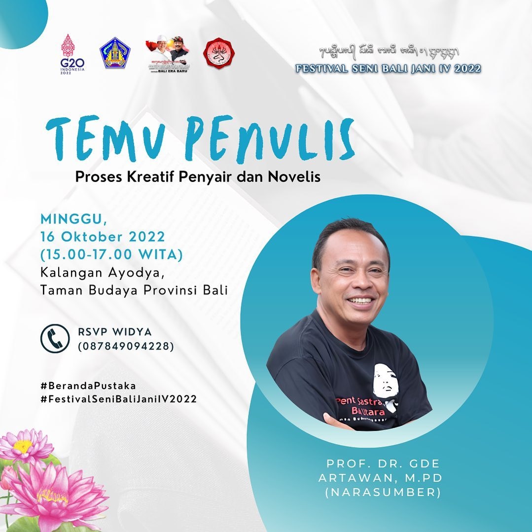 Semeton, Sahabat, yuk ke Beranda Pustaka untuk menghadiri “Temu Penulis” untuk belajar proses kreatif menulis puisi dan novel bersama Prof. Dr. Gde Artawan, M.Pd.