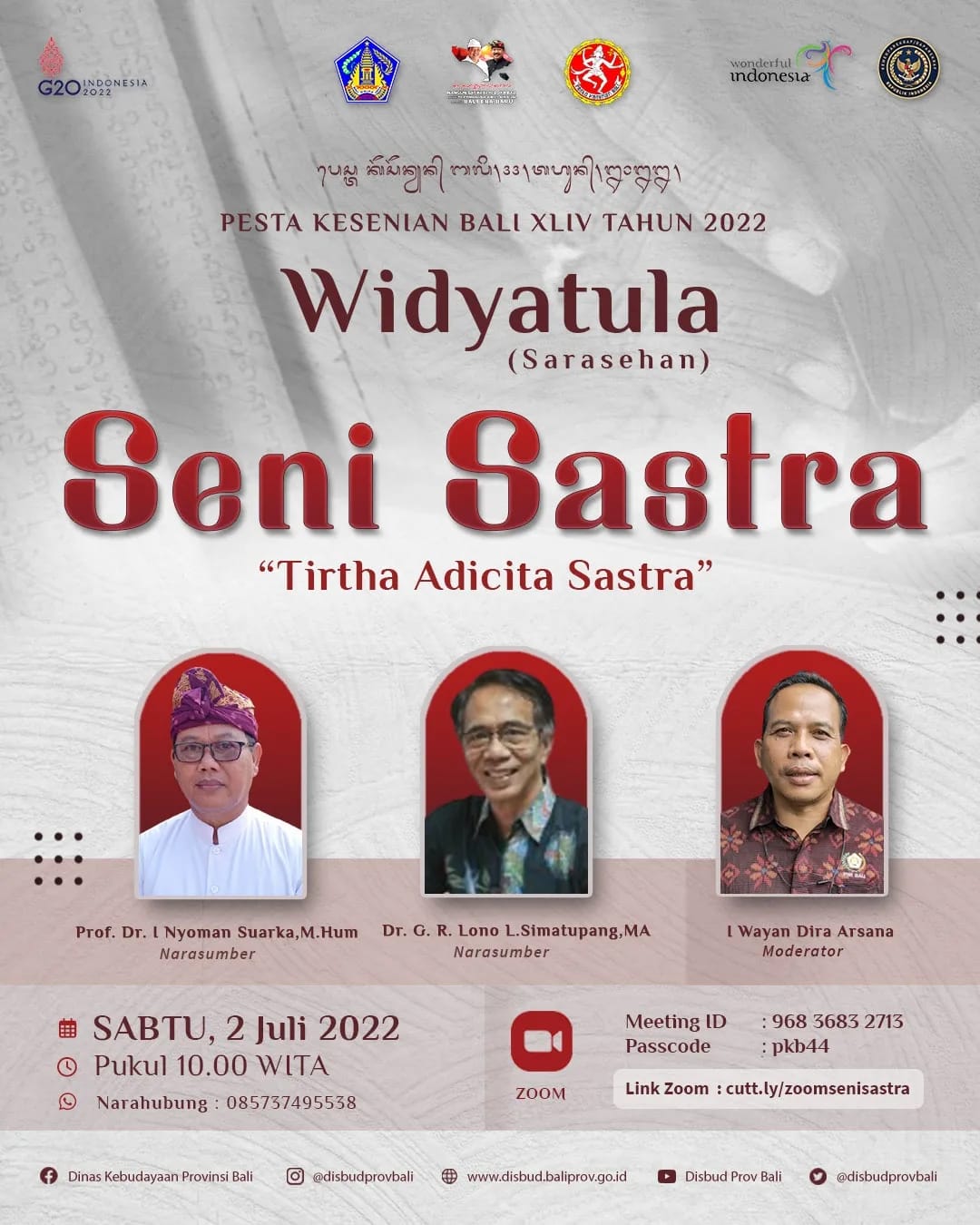 Acara Luring berlangsung di Ruang Padma Dinas Kebudayaan Provinsi Bali peserta terbatas maksimal 25 orang dengan tetap memperhatikan protokol kesehatan, serta Daring melalui Zoom Webinar dengan peserta maksimal 300 orang.