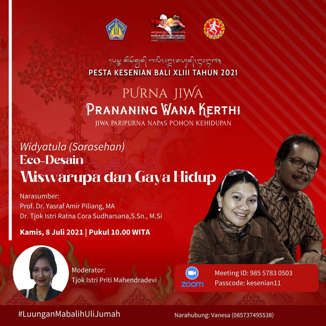 Dua narasumber yakni Prof. Dr. Yasraf Amir Piliang, MA dan Dr. Tjok Istri Ratna Cora Sudharsana, S.Sn., M.Si, akan membahas perihal bagaimana penerapan pendekatan desain yang elok bagi mata, tetapi mengandung unsur unik dan otentik warisan budaya lokal, sekaligus bersifat Eco-Desain— memanfaatkan bahan-bahan ekologis yang ramah lingkungan. Dibincangkan pula bagaimana seorang desainer mengolah secara kreatif elemen-elemen lokal yang unik berikut nilai-nilai filosofi yang terkandung di dalamnya menjadi sebuah kreasi produk yang menawan dengan sentuhan modern atau pun kontemporer—mencerminkan warna warni keindahan semesta (Wiswarupa). Terkait upaya pengembangan Eco-Desain, bagaimanakah mengelola gaya hidup masyarakat modern-kontemporer kini yang berbasis digital dan industri agar menumbuhkan ekosistem industri yang mendepankan upaya-upaya desain dan kreasi seni yang berkelanjutan (sustainable)?